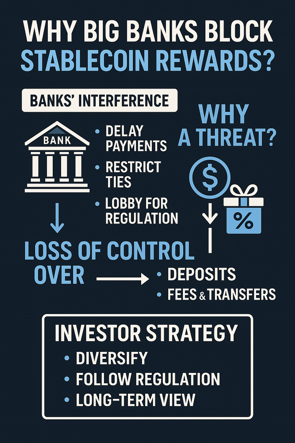 투자자, 요즘 뉴스와 커뮤니티에서 “대형 은행들이 스테이블코인 보상(예치 보상·리워드·이자형 서비스)을 막는다”는 말이 심심치 않게 들립니다. 왜 이런 일이 벌어질까요? 답은 간단합니다. 스테이블코인은 달러 등 법정화폐와 1:1 연동되면서도, 블록체인 네트워크 위에서 더 빠르고 더 싸게 이동합니다. 여기에 예치 보상까지 붙으면 전통 예·적금과 직접 경쟁하는 상품이 됩니다. 은행의 입장에서는 고객 예금과 수수료 수익이 줄어들 수밖에 없죠. 이 글은 ‘은행의 방해 시도 → 왜 눈엣가시가 되었는가 → 투자자 전략’ 순서로, 초보 투자자도 이해하기 쉽게 논리를 풀어 설명합니다. 핵심은 공포가 아니라 구조를 보는 것입니다. 구조를 알면 리스크를 피하고, 기회를 선별할 수 있습니다.